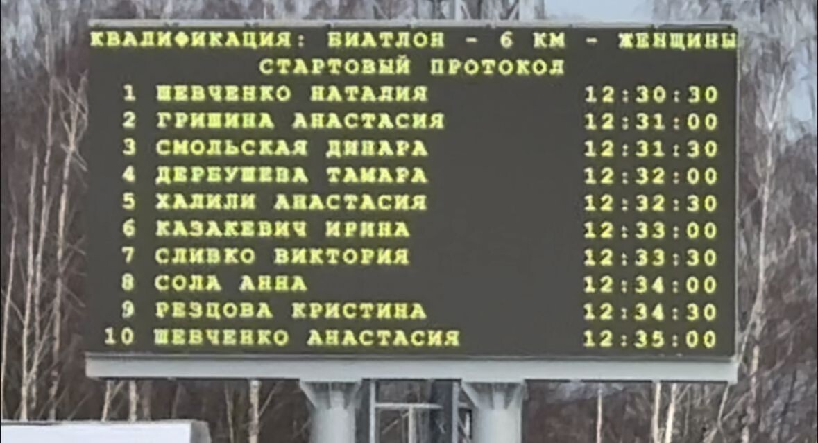 Первыми выступили биатлонистки. Они прошли 6 км. Лучший результат показала Наталия Шевченко (12:30:30). На втором месте Анастасия Гришина (12:31:00). Третьей пришла Динара Смольская (12:31:30).