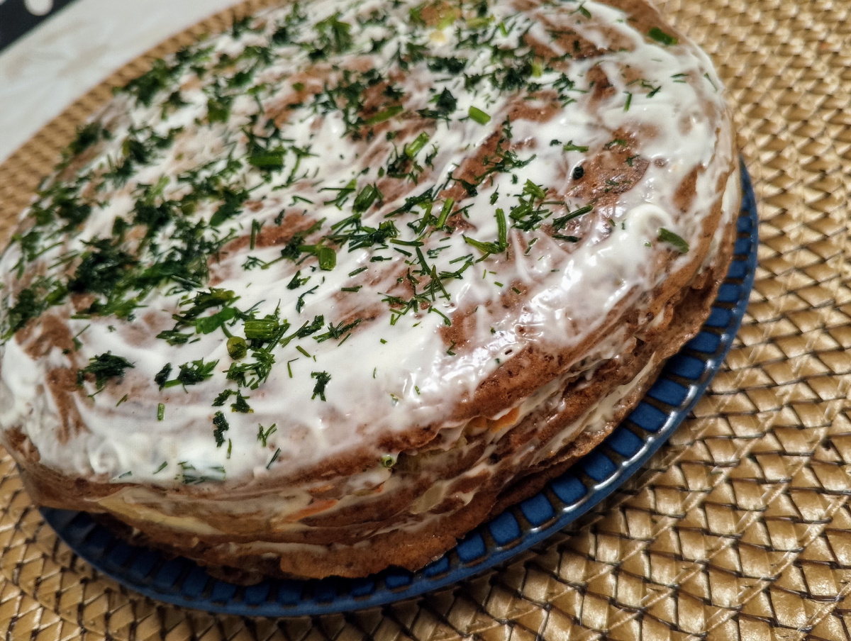 Печень куриная - 1 кг. Мука - 3 ст. л. Яйца - 3 шт. Молоко - 100 мл. Лук репчатый - 2 шт. Морковь - 2 шт. Майонез - 150 гр. Зелень свежая немного. Соль - по вкусу. Перец чёрный молотый - по вкусу. Масло растительное - для жарки. Подготовить продукты для печёночного торта. Куриную печень вымыть, очистить от плёночки и протоков. Пропустить печень через блендер, чтобы получилось однородной массой. Печёночную массу переложить в удобную ёмкость. Добавить яйца, перемешать. Приправить солью, перцем. Перемешиваем хорошенько. Добавлением молоко и опять всё хорошо перемешиваем. Всыпаем муку, перемешиваем до образования однородной массы. Масса должна быть без комочков. Тесто должно получиться по густоте как на оладьи. Добавлением растительного масла столовую ложку и опять перемешиваем. Из полученной массы жарим печёночные блинчики. Жарим на разогретой сковородке, смазанной растительным маслом. Обжариваем блины с двух сторон до румяности. Готовые блины складываем на тарелку стопкой и