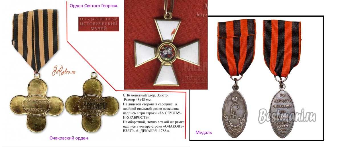 Здесь - это медаль, полученная за участие во взятии турецкой крепости Очаков в 1788 году. НО дело в том, что она даровалась рядовым и унтер-офицером. Поэтому или Ленский что-то путает, или Дмитрий Ларин не бригадир. Явное несоответствие, действительно, если медаль, а значит максимум унтер в 1788, то нет шансов, что к 11.1796 мог стать бригадиром.