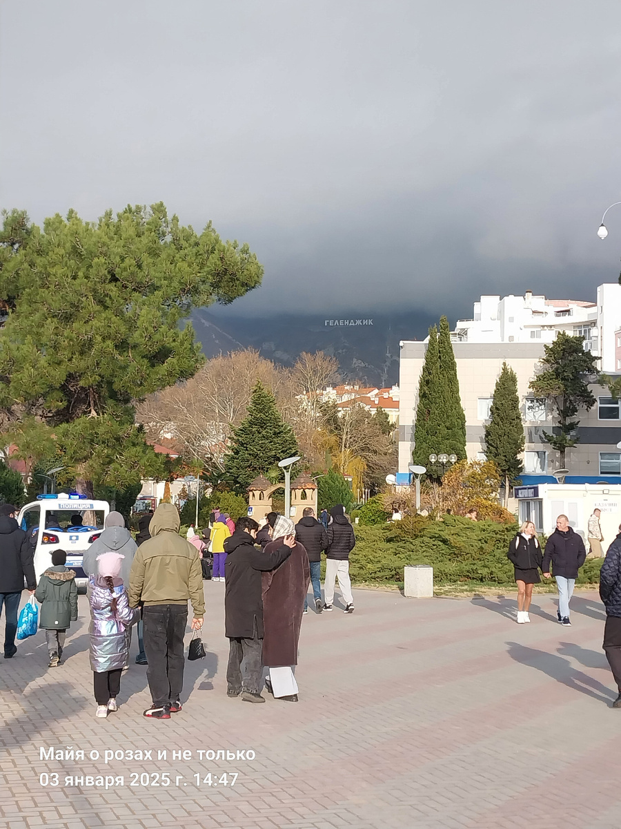 Продолжаю знакомить моих читателей с зимними пейзажами курортных городов. Чего я точно не ожидала увидеть в Геленджике, так это такого наплыва людей. И этому очень способствовала погода: тихий, тёплый и солнечный день в начале января. В горах висели чёрные тучи, а над морем светило солнце.