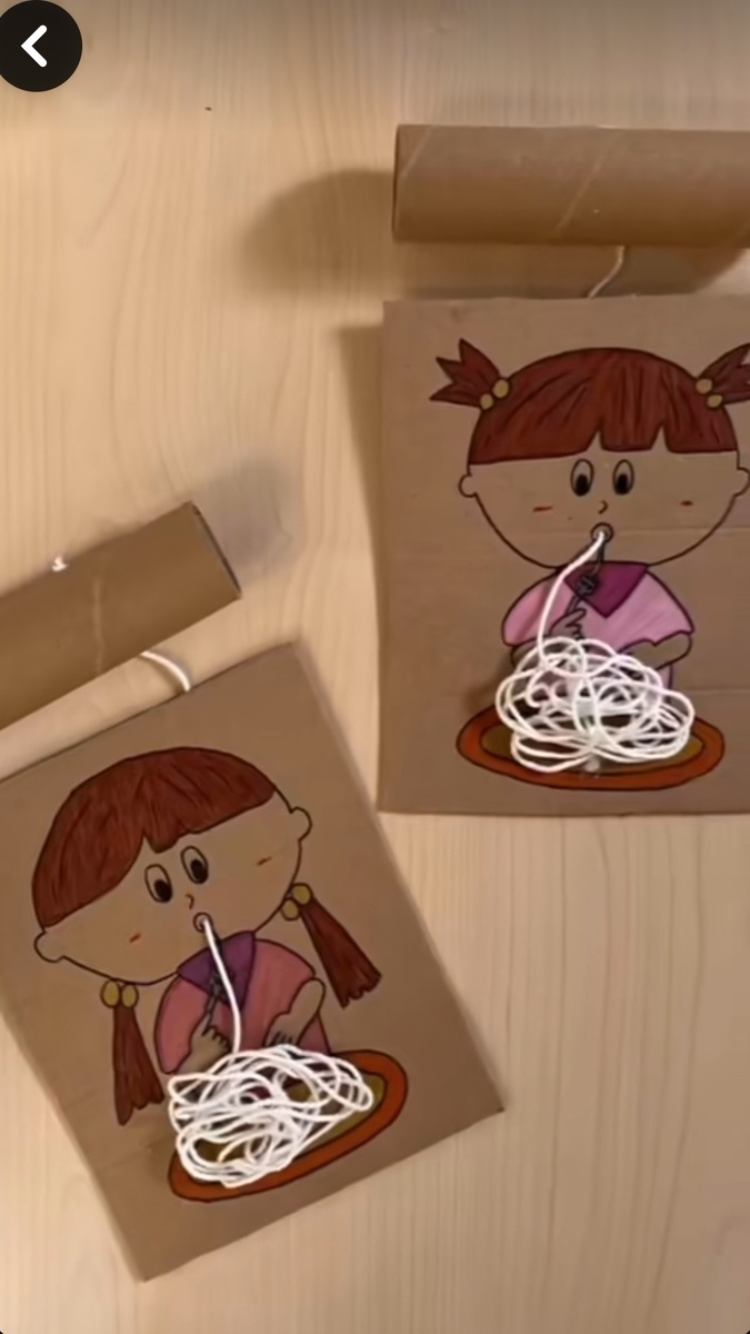 Чтобы организовать эту увлекательную игру, вам понадобится распечатать или нарисовать ребёнка с тарелкой на столе или в руках. Губы у ребёнка должны быть вытянуты в трубочку. Затем сделайте небольшое отверстие в его рту и протяните через него нитку, чтобы она напоминала спагетти на тарелке. Подготовьте материал, на который будет удобно наматывать нитку. Цель игры — намотать нитку до конца, как будто ребёнок на картинке съел все макароны.