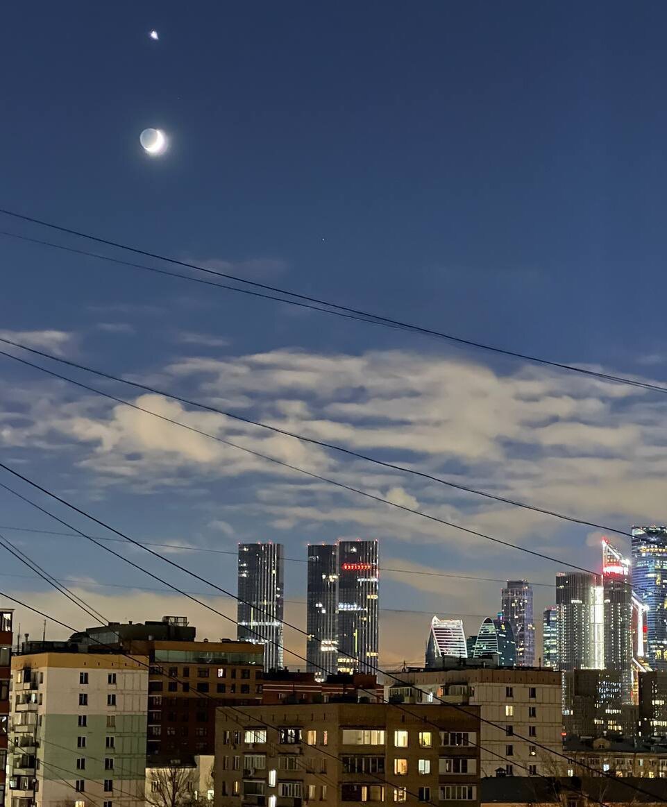 • Луна, находящаяся в фазе молодого месяца, и яркая Венера словно «танцуют» на ночном небе.