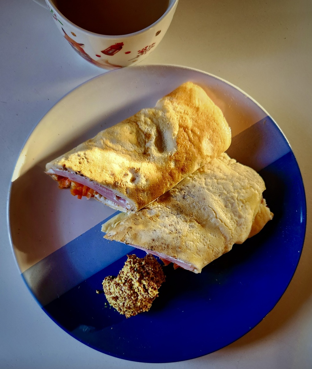 По питанию сегодня все как обычно. Утром блин получился! Индеечья ветчина, корейская морква и рикотта.
