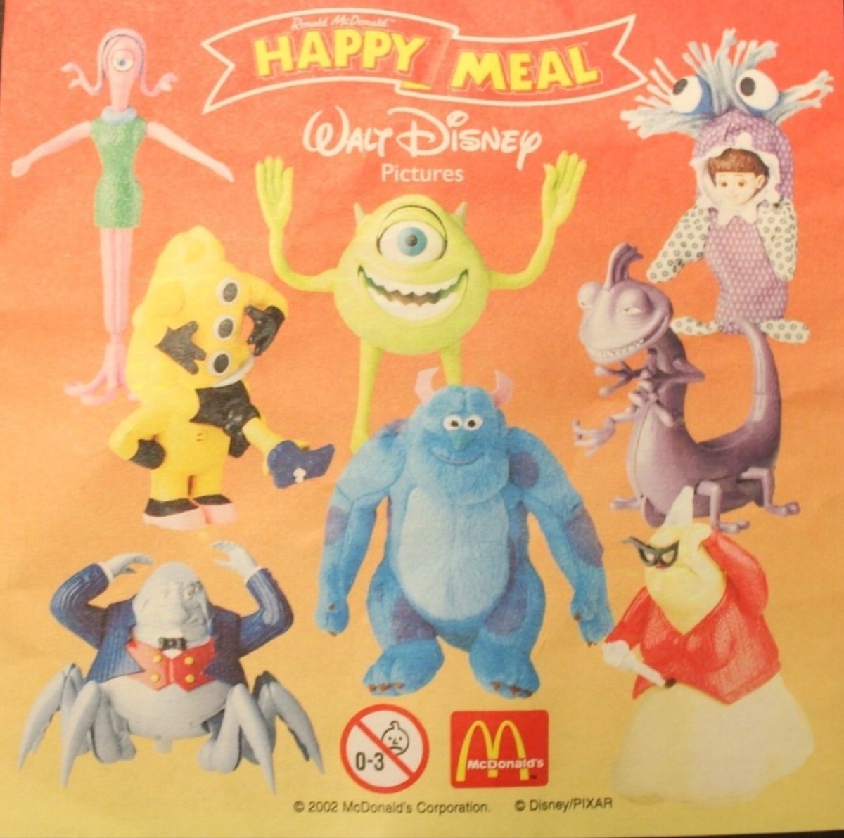 В серии Корпорация Монстров 2002 из McDonald's 8 персонажей одноименного мультфильма. Мой любимый диснеевский мультфильм. Вот какие игрушки мы увидели в Хеппи Миле : 1.Салли 2. Майк Вазовски 3. Бу 4. Селия Мэй 5. Рози 6. Рэндалл Боггс 7. Генри Ватерноуз 8. Агент CDA В моей коллекции есть пока только Салли: Если интересуют другие игрушки из McDonald's , то переходим на Главную страницу