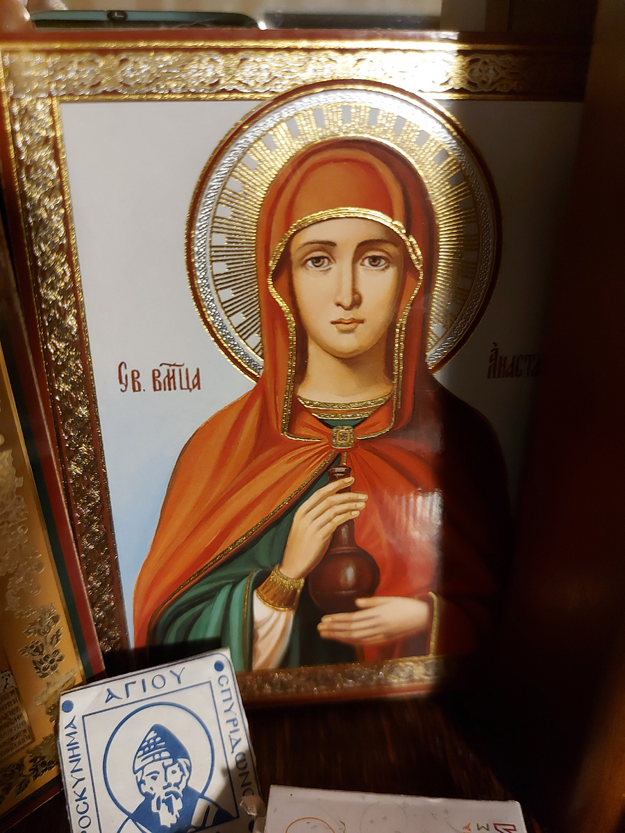 Скажу всё же несколько слов о той, что сопровождает меня всю жизнь. Некий священник привязал меня к Анастасии Патриции Александрийской (23.03) при святом крещении. Это моя святая. Но про нее долгое время не было возможности найти информацию. Зато Узорешительница, день памяти которой как раз сегодня, по крайней мере своими иконками в церковных лавках была довольно распространена. Дома у родителей до сих пор стоит образ, приобретенный в 90-е. А эту икону мне привезла дорогая Ира из Абхазии (человек, в которого я верила и верю больше нее самой, мне кажется)). Видите этот сосуд в руках у святой Анастасии? Все знают, что она считается покровительницей заключенных (в тюрьму), но так же можно и для заключенных в психиатрические лечебницы, меньше - молятся о долгожданной беременности ( как узо разрешительнице бесплодия, смысл, думаю, понятен). Но мало кому известно, что Анастасия была врачевательницей любых недугов, и считается, что этот дар (лечить) она получила за подвиги посещения и