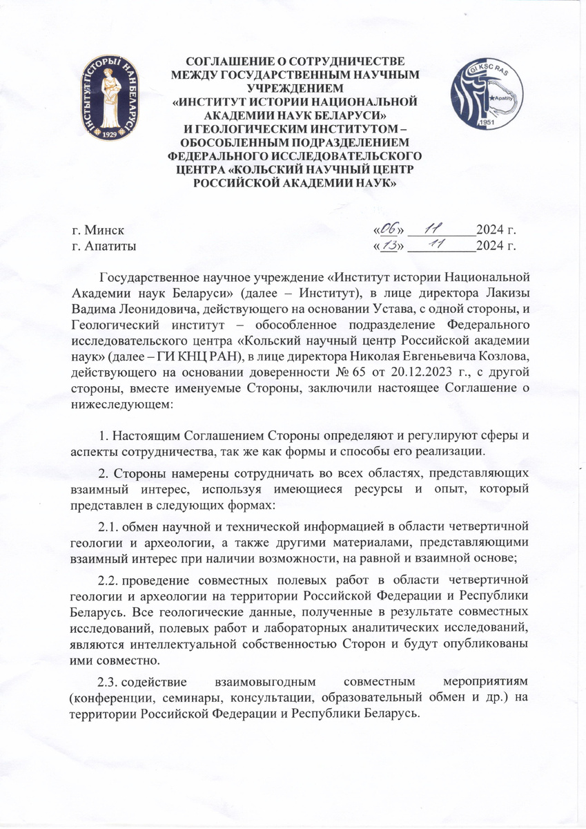Институт истории Национальной академии наук Беларуси и Геологический институт — обособленное подразделение Федерального исследовательского центра «Кольский научный центр Российской академии наук» заключили Соглашение о сотрудничестве. Главной целью соглашения является обмен научной и технической информацией в области четвертичной геологии и археологии, а также проведение совместных полевых работ на территории Российской Федерации и Республики Беларусь.