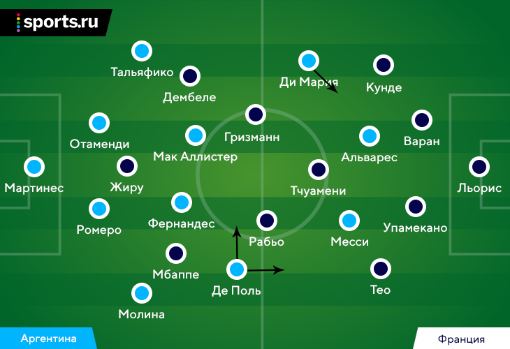 По части стартовых идей тренер Аргентины просто уничтожил оппонента. Он адаптировался во всех стадиях – и его адаптации оказались пугающе точными. Символическим признанием тактического поражения стали замены Дешама до конца первого тайма.