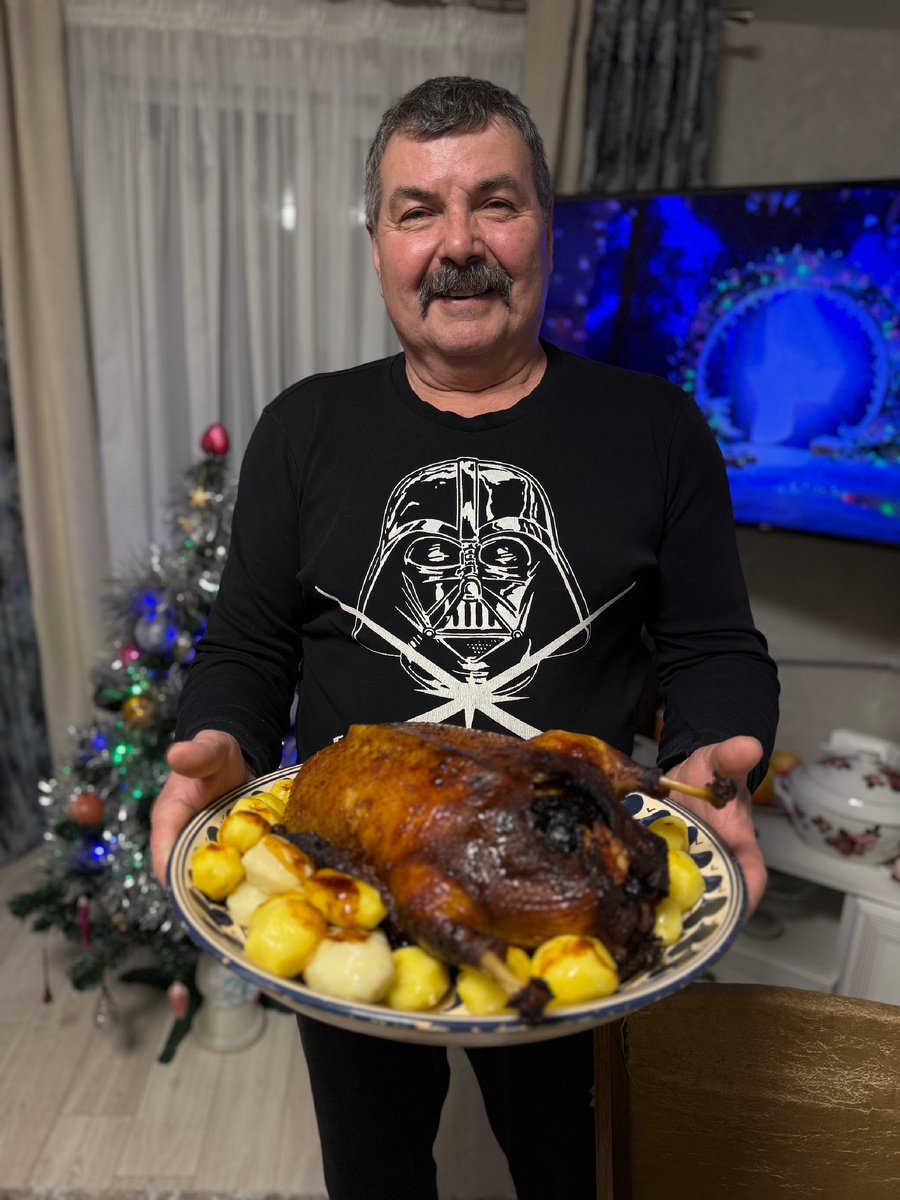 Навестил родительский дом. Приготовили домашнюю утку около 3кг по рецепту, который уже выкладывал, но в этот раз выпекали 2,5 часа при t 160 и потом томилась до полного остывания духовки больше часа. Но повторение-мать учения . Выкладываю рецепт снова. Утка Кон*як 30гр Вода 2л Мед 2чл Соль 200гр Чеснок 3 зуб. Сахар 20гр. Соевый соус 2ст л Лимон 1шт. Паприка 1/2чл Апельсин 2шт Яблоко 1шт Айва 1шт Чернослив 70гр Выложить на дно подходящий формы ломтики лимона и апельсина. У утки вырезать сальные железы на гуске и положить на цитрусовые грудкой вниз. Залить солевым раствором (2 л воды+200гр соли+20 гр сахара), закрыть и оставить на 12 часов. Апельсин почистить и порезать на крупные куски, у яблока и айвы вырезать середину и так же порезать, так же для начинки понадобится чернослив без косточек. Утку хорошо промыть под проточной водой, полностью нафаршировать фруктами и закрепить шпажкой или зубочисткой. Сделать глазурь из меда, кон*яка, соевого соуса, тертого чеснока, папри
