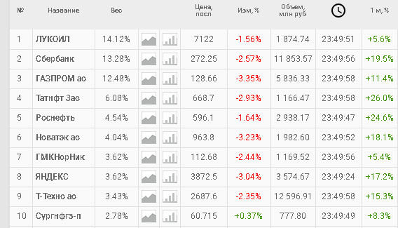 Новый год для многих бумаг начался с падения котировок вчера, 3 января. Cоответственно, спад коснулся и Индекса Мосбиржи, который понизился до 2828,5 п. (-1,89%). При этом по таблице видно, что в Топ-10 участников Индекса динамика за месяц очень положительная (у всех рост, до 26% у «Татнефти»).