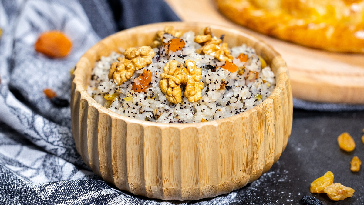 • Растительное масло – 30 мл 1. Рис заранее отварите и остудите. Курагу и изюм залейте кипятком. 2. Влейте в сотейник воду и добавьте мак. Доведите жидкость до кипения, а затем варите на медленном огне в течение 25 минут. 3. Сухофрукты и грецкие орехи нарубите средним кубиком. Добавьте к ним мед и перемешайте. 4. Соедините в миске рис, мак, растительное масло, смесь из сухофруктов и орехов. Хорошо перемешайте. 5. Готовой кутье дайте настояться пару часов. Переложите кашу в тарелку для подачи. По желанию украсьте блюдо ядрами грецкого ореха. Приятного аппетита! Подробный видеорецепт: https://dzen.ru/video/watch/67771349130