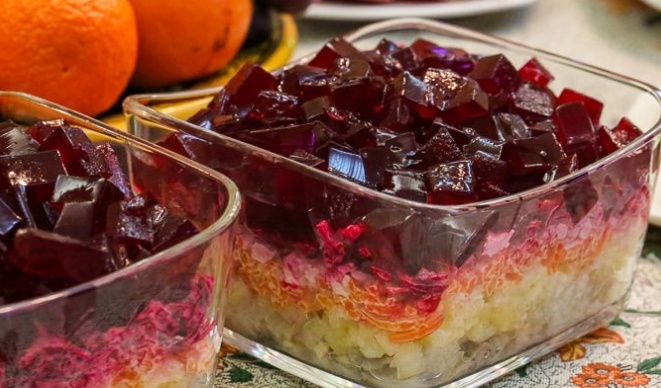 соль - по вкусу дополнительно: вода для замачивания желатина - 100 мл. Подготовить все овощи для салата. Свеклу, картофель и морковь, вымыть и сварить в подсоленной воде до готовности (свеклу варить отдельно). Вместо варки овощи можно запечь. Для этого овощи смазат