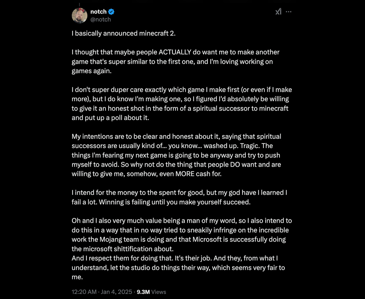 Маркус "Notch" Перссон намекнул на возможность создания духовного наследника Minecraft. В новогоднем обсуждении в твиттера он предложил подписчикам выбрать, какой проект им хотелось бы видеть от него в 2025 году: традиционный рогалик с элементами данжен-кроулера от первого лица или "духовного наследника" Minecraft. Несмотря на просьбу голосовать за первый вариант, около 78% из почти четверти миллиона проголосовавших выбрали новую игру в стиле Minecraft. Я фактически анонсировал Minecraft 2. Я понял, что люди действительно хотят, чтобы я сделал игру, похожую на первую, и мне снова нравится разрабатывать игры. Он уточнил, что не имеет запрета на конкуренцию после продажи Minecraft Microsoft — был только годовой период, когда он не мог создавать игры с модифицируемым ландшафтом. Однако использование названия Minecraft "было бы незаконным". Вместо этого я бы создал новую оригинальную игру того же типа и назвал ее по-другому. Такие игры обычно называют "духовными наследниками", хотя часто о