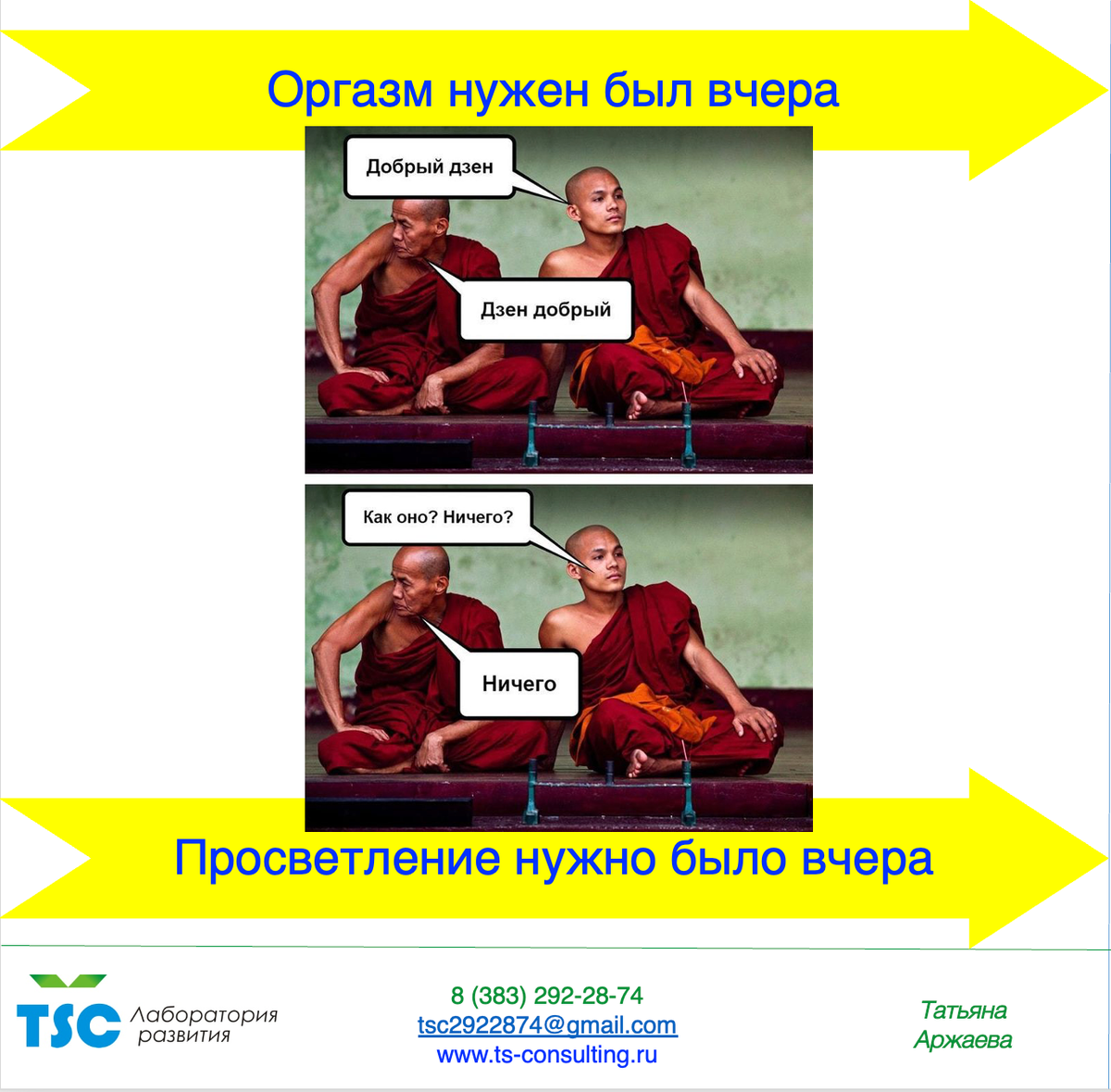 Давайте применим это все к просветлению? Самое фееричное это первое - «просветление нужно было еще вчера», «нужно просветление срочно», «делай больше просветлений», «делай просветление раньше», «делай всё для просветления и больше, чем всё», «давай-давай просветление», «дедлайн у просветления». Снова это вызывает вопросы об адекватности, которая ценна в любых темах, в том числе и на пути духовного развития.