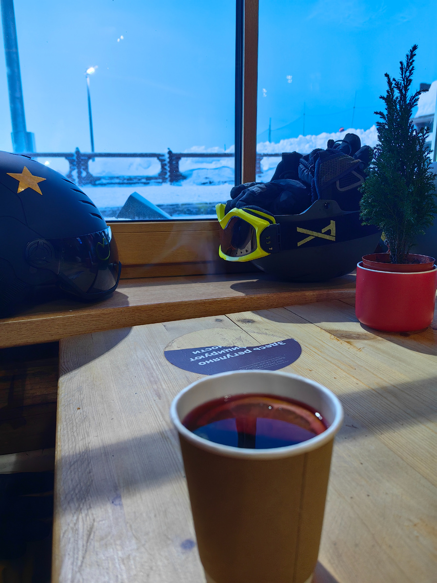 Сегодня был опять целый день катания. Спала я странно, с вечера было не уснуть, очень болела нога. Я ее и мазала и обезболивающее выпила. Подкладывала под коленку подушку, вставала, ходила, ныла и думала, что точно катание моё закончено. Заснула с большим трудом. Утром проснулась и лежу. Боюсь пошевелить ногой, потом тихонько встала и пошла. При определённом положении побаливает немного, но жить можно. Сегодня за ужином видели девушку с гипсом на руке, а вторую - с гипсом на ноге, сразу понятно, что отдых удался. Утром в автобусе термометр показывал -20. Нос щипало и дышать трудно было. А еще после тёплого автобуса маска у меня запотела немного. Переехали мы с северного на южный склон. Через полчаса катания у меня замёрзли руки и стало немного плохо. В итоге я поехала в кафе и выпила глинтвейн, погрелась у батареи. После того, как пришла в себя и согрелась, мы поехали на гондоле наверх. А наверху минус приличный (-14 писали на подъёмнике) и ветер. Пока ехала вниз, опять замерз