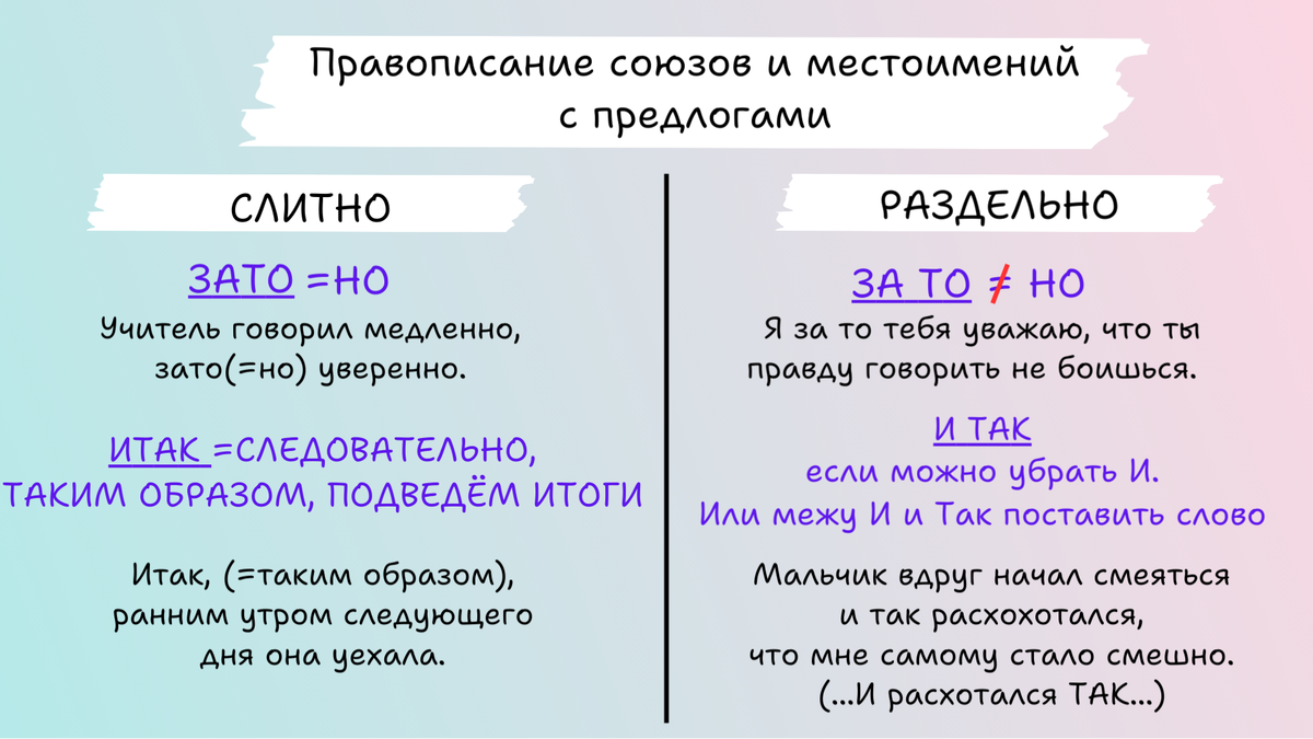 Есть слова, написание которых ставит в тупик. Их нельзя просто так взять и написать слитно или раздельно. Хотя как их раздельное, так и слитное написание - верно, в зависимости от того какой частью речи они являются. Если союзами - слитно, а если другими частями речи - раздельно. Не ошибиться помогут несколько секретов, которыми я поделюсь. Готовы? Тогда начинаем! Если ЗАТО можно заменить НО, пишем слитно ЗАТО=НО Учитель говорил медленно, зато(=Но) уверенно. А если заменить нельзя, то перед нами предлог ЗА и указательное местоимение ТО, пишем раздельно. Я за то тебя уважаю, что ты правду говорить не боишься. Итак — союз, если можно заменить выражениями «следовательно», «таким образом», «подведём итоги». Чаще всего стоит в начале предложения и отделяется запятой. Итак, (= таким образом), ранним утром следующего дня она уехала. Если можно убрать «и» без потери основного смысла или вставить слово между «и» и «так», то пишется раздельно. Значит перед нами союз «и» + местоименное наречие