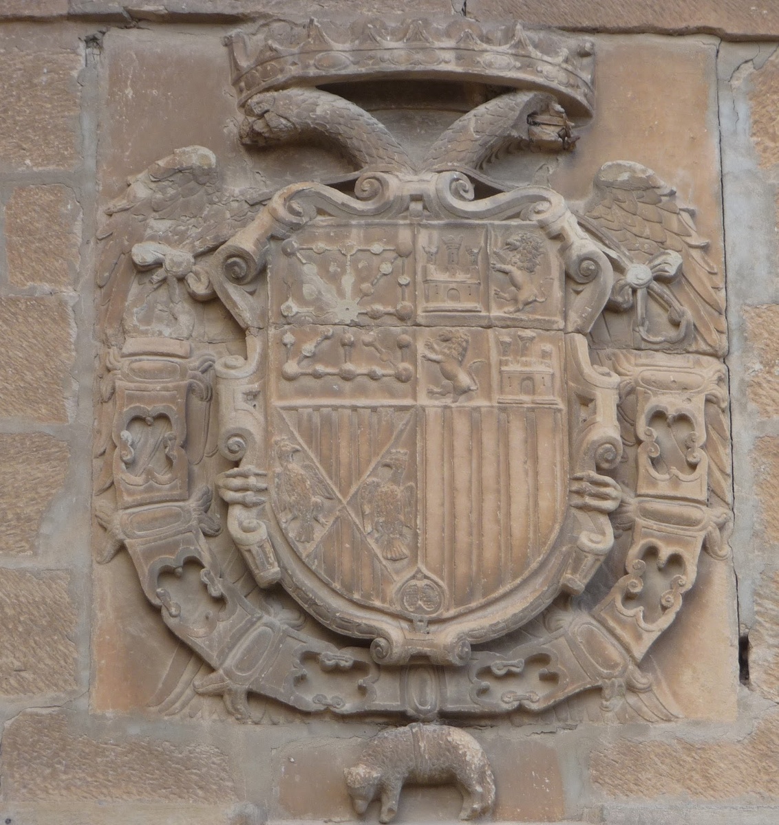 Этот герб над воротами города Вьяна был создан уже после смерти императора Карла V (короля Испании Карла I). Если я правильно понял исходный текст с испанского сайта, герб был установлен в 1583 году, и за работы отвечал некий Амадор де Сегура. Судя по всему, хорошо, что король Филипп II этого герба никогда не видел, иначе кто знает, не сносить бы этому де Сегура головы.