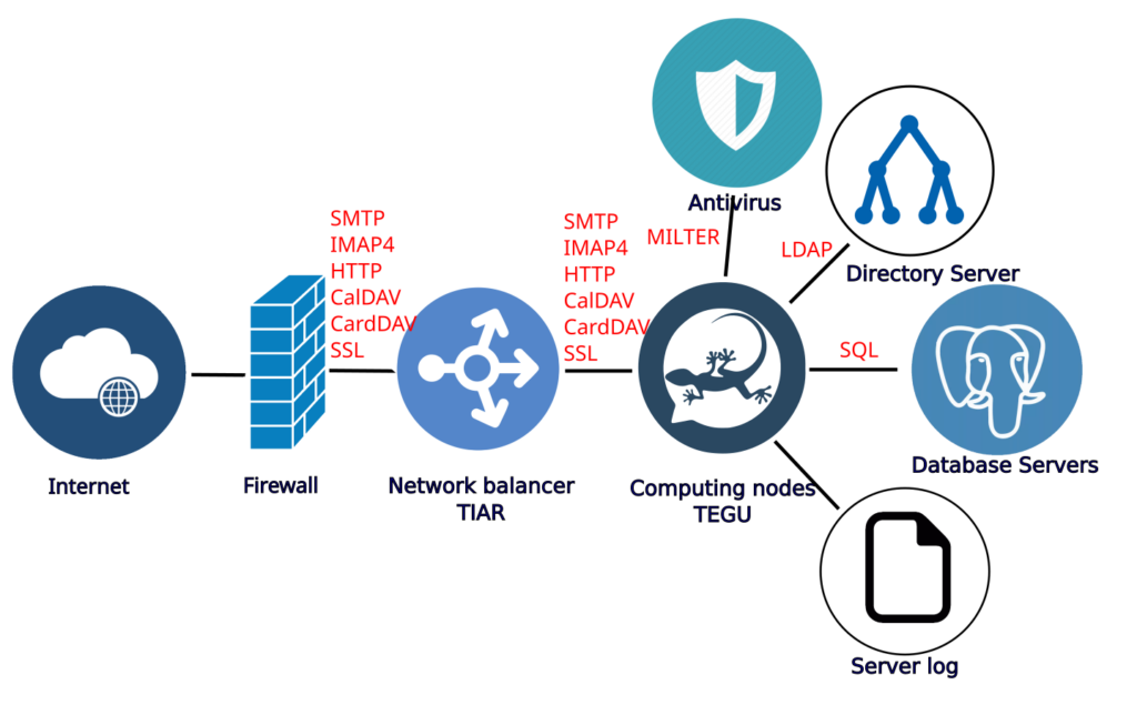 - Протоколы используемые между компонентами почтовой системы – запросы к СУБД Postgres, запросы к серверу каталогов LDAPv3.