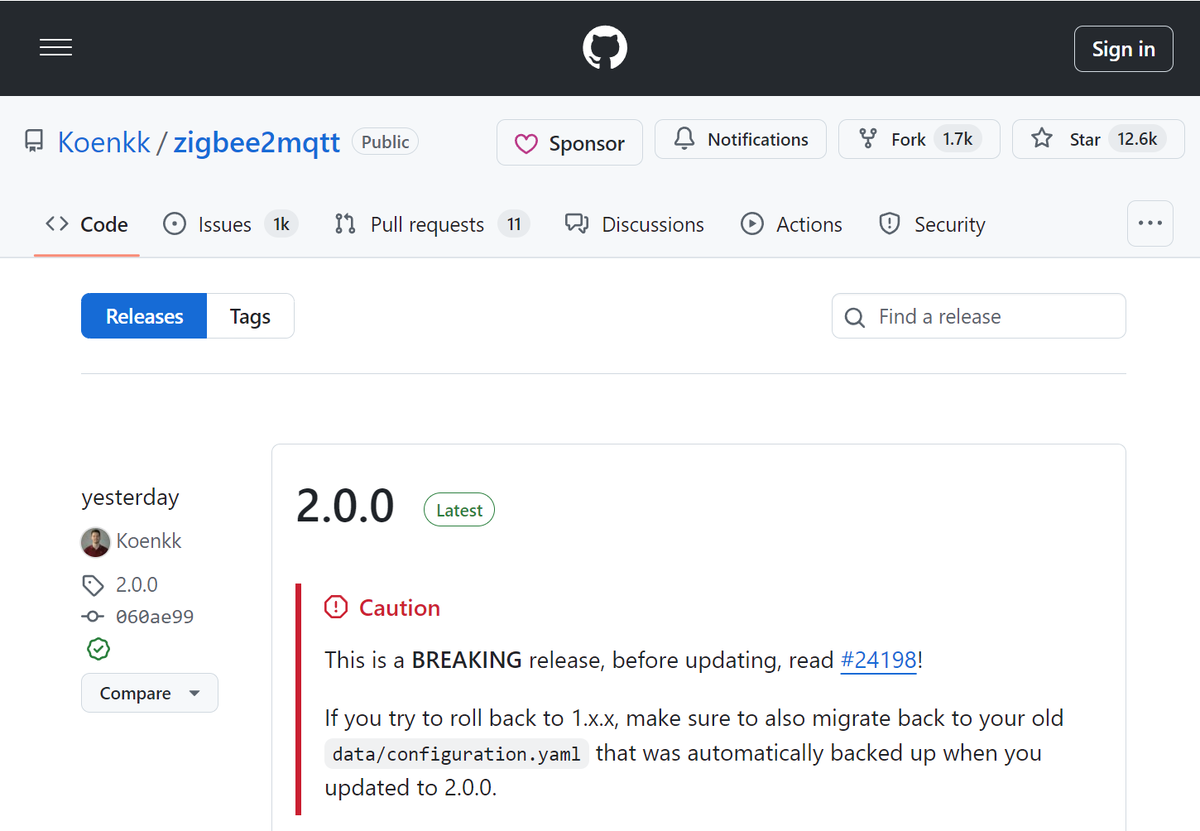Как обычно, смена мажорного номера версии (первой цифры) означает кардинальные изменения продукта. А нулевые минорные значения версии (вторая и третья цифры), как правило, предупреждают о возможной "сырости" продукта, то есть недостаточной степени его оттестированности. И зачастую при обновлении ПО мажорной версии возникают различные проблемы совместимости. Так случилось и в этот раз. И я, не будучи "прошаренным" специалистом, убил почти целый день на это обновление. Правда, предположение о "сырости" именно Zigbee2MQTT в итоге не подтвердились.