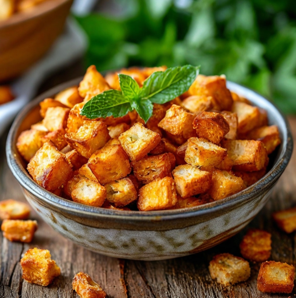 Для приготовления крутонов вам понадобятся: - Батон или хлеб (белый, черный или багет) - Оливковое масло (3-4 ст. ложки) - Чеснок (2-3 зубчика, по желанию) - Соль и перец (по вкусу) - Пряности (орегано, базилик или итальянские травы, по желанию) Приготовление: 1. Нарежьте хлеб на кубики размером около 1-2 см. 2. В миске смешайте хлеб с оливковым маслом, измельченным чесноком, солью, перцем и пряностями. 3. Выложите хлебные кубики на противень в один слой. 4. Запекайте в разогретой до 180°C духовке около 10-15 минут, пока они не станут золотистыми и хрустящими. Перемешивайте их в процессе, чтобы подрумянились равномерно. 5. Оставьте остывать и используйте в салатах или в качестве закуски. Готовые крутоны можно хранить в контейнере несколько дней. Приятного аппетита! Спасибо за лайк и подписку🥰🍞
