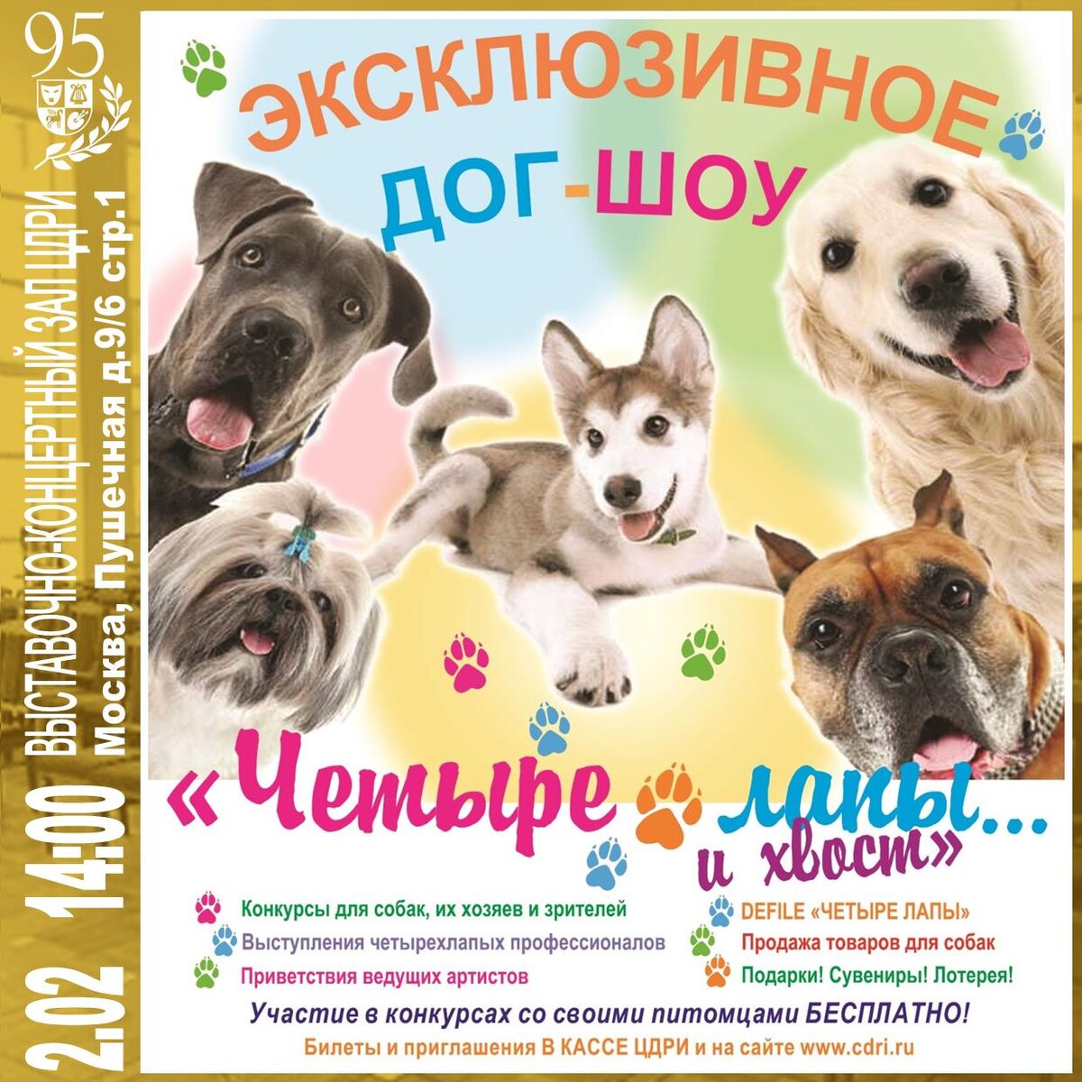 Эксклюзивное дог-шоу «ЧЕТЫРЕ ЛАПЫ И ХВОСТ» В мире миллионы людей, которые обожают собак. Конечно, как могут не вызвать умиление эти ласковые, преданные, умные и такие симпатичные животные! Ежегодная веселая программа с участием собак разных пород дог-шоу «Четыре лапы и хвост» для всех любителей собак, заводчиков, тех, кто подумывает обзавестись питомцем. Основная часть программы — конкурсы для гостей и демонстрация результатов домашней дрессуры. Принять участие в них смогут все желающие. Кроме этого, зрители увидят: краткие выступления дрессировщиков и заводчиков, номера с участием профессиональных четвероногих артистов, показ одежды для питомцев. Также будет организована продажа модных нарядов для ваших любимцев, дефиле «Четыре лапы и хвост». Любуемся, восхищаемся, умиляемся! Традиционно организаторы готовят для всех участников розыгрыши призов и лотереи. Возможно также присутствие на мероприятии ветеринарного врача. Во время проведения Дог-шоу рабо