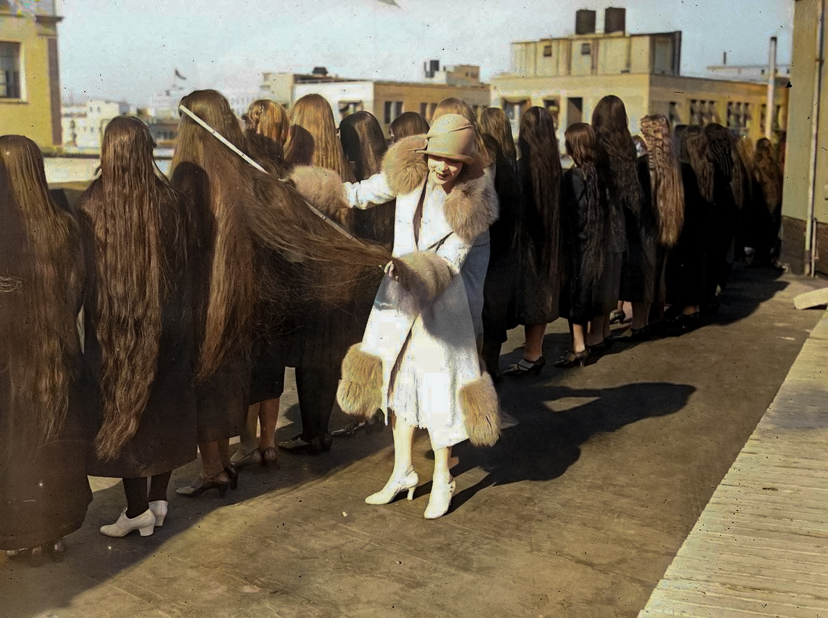 Женщина измеряет длину волос на конкурсе. Лос-Анджелес, 1926 год.