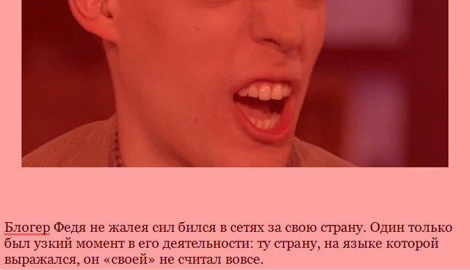 Блогер Федя не жалея сил бился в сетях за свою страну. Один только был узкий момент в его деятельности: ту страну, на языке которой выражался, он «своей» не считал вовсе. Своя для Блогера Феди страна существовала только внутри его черепа, и такое обстоятельство держало Федю всё время в злобно-боевом расположении его блогерского духа. Мечтаемая Прекрасная «Своя Страна» отсутствовала, падла, как факт, а жить приходилось не в Своей, а в нехорошей «Этой». Был, правда, момент, когда Феде показалось, что Своя Страна реально существует, и она находится на этом же глобусе, но просто где-то в другом месте. Почувствовав такое, Федя даже засобирался, и, в порыве, съездил на эту благодатную землю, но и там, как оказалось, был один обман, всё не то, не так, а при ближайшем рассмотрении, вылезла куча разных недостатков, не позволявших утолить Федину жажду Родины, как-то утихомириться и просто жить в найденной уже, наконец, Своей Стране. Нет, ни одно место на глобусе из реально существующих Фединой м