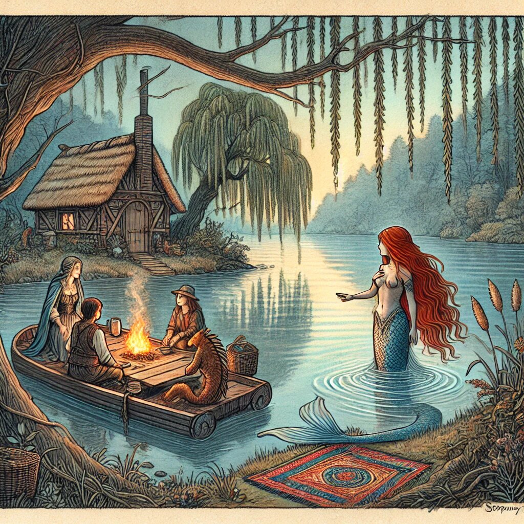 Привязав плот, Алиала ловко спрыгнула на мостки уже на двух ногах. Оказывается, наша проводница неплохой маг. Не все русалки способны отращивать себе ноги по необходимости, поэтому для полностью водоплавающих на причале был повещен серебряный колокольчик, до которого можно было дотянуться прямо из воды. Когда Алиала дёрнула за веревочку, раздался громкий, но мелодичный звон. Через минуту на пороге дома показалась высокая симпатичная женщина. Она всматривалась в лица непрошенных гостей, прикрывая глаза рукой от утреннего солнца.