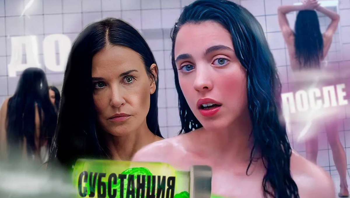 Какие вопросы лично у меня оставила сия скандальная лента? Я признаться, вообще не большой поклонник боди-хорроров. Вообще стараюсь таковых избегать при кинопросмотре. Лично у меня этот сомнительный поджанр фильмов ужасов вызывает искреннее отвращение. Хотя и понимаешь, что все тут бутафория, а кровь на самом деле дешевый кетчуп размазанный, но все же, как говорится, осадочек отвращения остается. Название фильма переведено с английского на русский язык немного неточно. Слово The Substance скорее можно истолковать как «вещество». То есть, ту самую зеленую бяку, что колет себе в попытке вернуть ушедшую молодость главгероиня Элизабет Спаркл (Деми Мур). Вообще-то той еще скромнице Маргарет Куолли, дабы поднять кексуальный имидж своей героини, пришлось носить силиконовые накладки на грудь. А перед съемок откровенных сцен весьма вызывающей аэробики, по собственному признанию, еще и слегка текилу подбухивать. Купальник, во избежание конфузов, кстати, крепили на двухсторонний скотч. Чтобы н