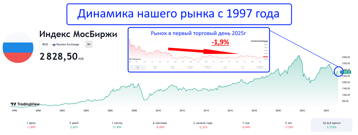 Скоро 10 января, а это значит, что я, следуя своей инвестиционной стратегии, буду покупать дивидендные акции. В этой статье я покажу список качественных дивидендных бумаг для инвестирования "прямо сейчас"! Первый торговый день 3 января в новом 2025 году наш рынок начал снижением. Это можно списать на коррекцию после бурного роста на "новогоднем ралли", на котором рынок за 10 дней прибавил почти 20%: Однако, многие инвесторы задаются вопросом: "Что будет дальше с нашим рынком?". Чтобы на него ответить, я предлагаю посмотреть на историю, а именно, как наш рынок исторически вел себя в первые месяцы нового года.
