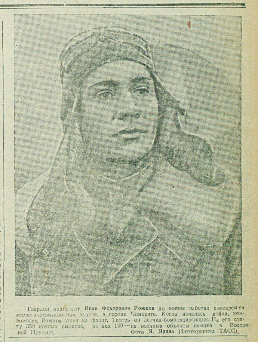 «Гвардии лейтенант Иван Федорович Рожков до войны работал слесарем на масло-экстракционном заводе, в городе Чимкенте. Когда началась война, комсомолец Рожков ушёл на фронт. Теперь он лётчик-бомбардировщик. На его счету 350 ночных вылетов, из них 100 – на военные объекты немцев в Восточной Пруссии».