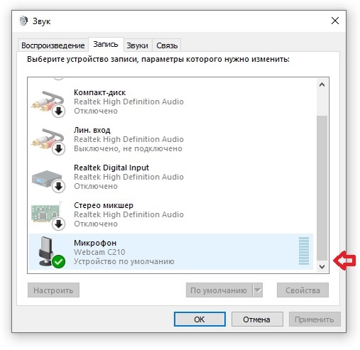 Выделяем активированный микрофон - правой кнопкой мышки свойства.