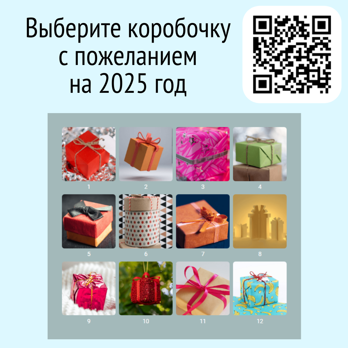 Приходит время для гаданий, и мы предлагаем Вам выбрать себе пожелание на 2025 год! Пусть 2025 будет светлее и радостнее для всех нас! Для выбора подарка можно воспользоваться QR-кодом на картинке или перейти по ссылке: https://interacty.me/projects/9c51482ef8b8d5c8 Напишите в комментарии, «подошел» ли Вам подарок?