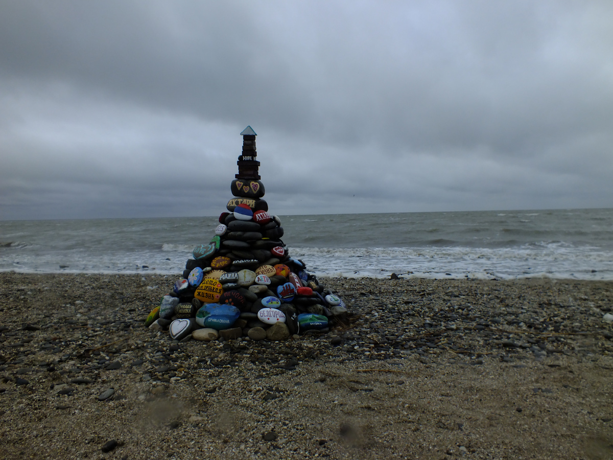 В Приморско-Ахтарске на берегу Азовского моря встретил интересную инсталляцию. Это пирамида сложеная из камней очень напоминает новогоднюю ёлку. Камни разукрашены и на них написаны слова, названия городов: Ржев, Южно Сахалинск, Челябинск, Алушта, Архангельск... Это то, что я запомнил, добрые слова: любовь, семья, надежда... Интересная инсталляция! Добра и много теплых слов вам в новом году! Видеосюжет