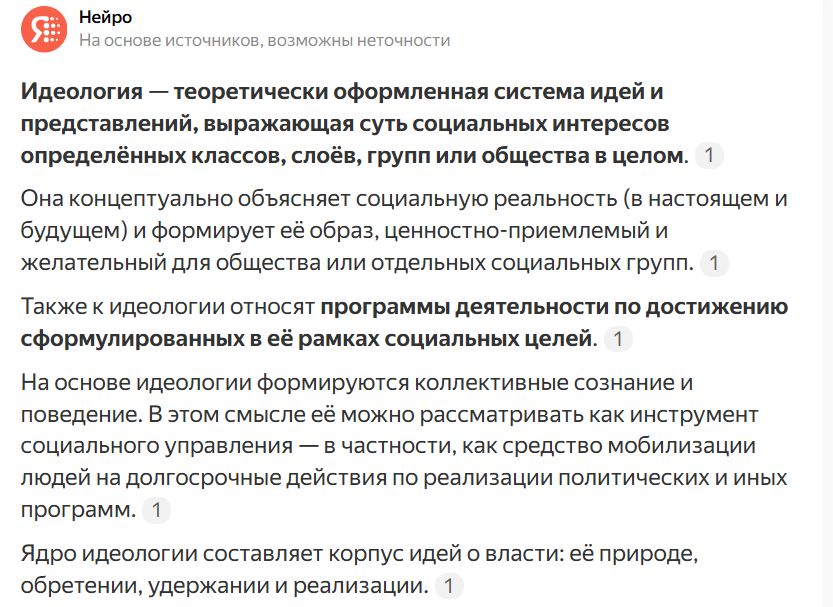 Один из комментаторов к статье "Как избавиться от идеологии" прямо написал: ""удовольствие" вот новая идеология. она не оправдывает, а превозносит на пьедестал любые способы получения удовольствия - "Ни о чем не думай, не заботься, жизнь - это сплошной кайф". Я озадачилась. Я как-то считала, что идеология - это что-то про разум, а тут "идеология желудка". Ладно, засучила рукава, полезла разбираться. Для начала, как обычно, словарное значение слова "идеология": Прямо с заглавной страницы Яндекса читаем: А теперь открываем Философский энциклопедический словарь и видим, что "система взглядов и идей, в которых осознаются и оцениваются отношения людей к действительности и друг к другу, социальные проблемы и конфликты, а также содержатся цели (программы) социальной деятельности, направленной на закрепление или изменение (развитие) данных обществ. отношений" (М.: Советская энциклопедия. Гл. редакция: Л. Ф. Ильичёв, П. Н. Федосеев, С. М. Ковалёв, В. Г. Панов. 1983.) То есть вот так простенько