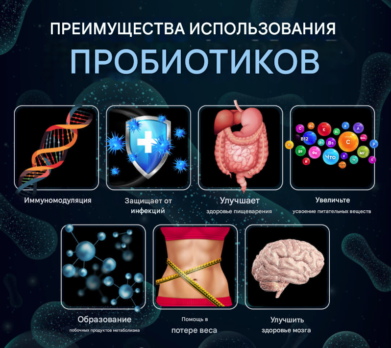 Пробиотики — это важные микроорганизмы, которые оказывают мощное влияние на здоровье человека: Иммуномодуляция Пробиотики укрепляют иммунитет, помогая организму справляться с инфекциями и воспалениями. Защита от инфекций Они создают барьер против вредных бактерий, вирусов и других патогенов, снижая вероятность заболеваний. Улучшение пищеварения Пробиотики способствуют нормальной работе кишечника, предотвращают вздутие и улучшают усвоение пищи. Увеличение усвоения питательных веществ Они помогают организму лучше усваивать витамины и минералы, такие как витамины группы B, витамин D, магний и кальций. Снижение побочных продуктов метаболизма Пробиотики очищают организм от вредных веществ, улучшая общее состояние здоровья. Помощь в потере веса Баланс микрофлоры способствует нормализации обмена веществ и контролю веса. Улучшение здоровья мозга Кишечник и мозг тесно связаны. Пробиотики улучшают настроение, концентрацию и когнитивные функции. Простое решение для вашего здоровья Чтобы легче сле