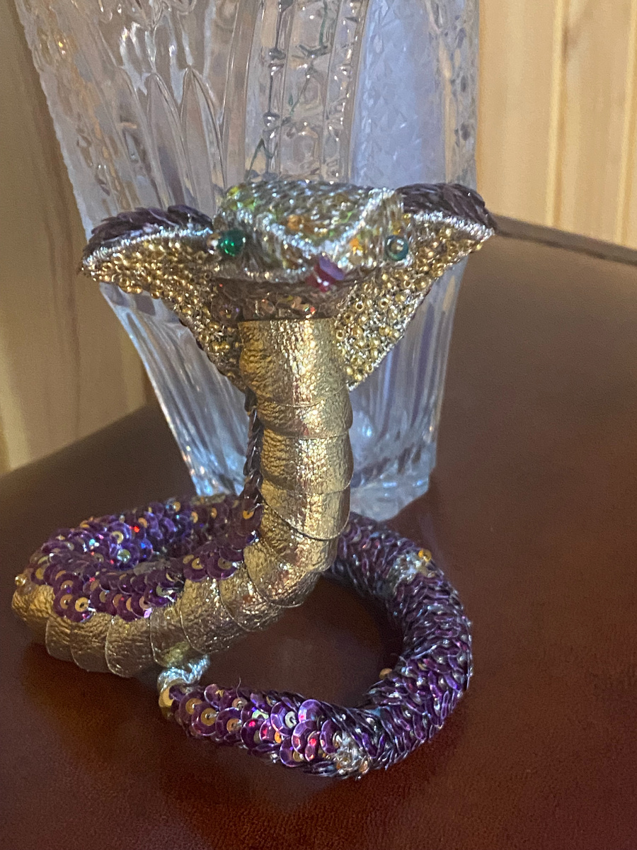 Мордочка и капюшон Кобры это сложная три Д вышивка, каркас из фетра, вышивка нитками, пайетками, для укрепления каркаса использовала металлическую проволоку.