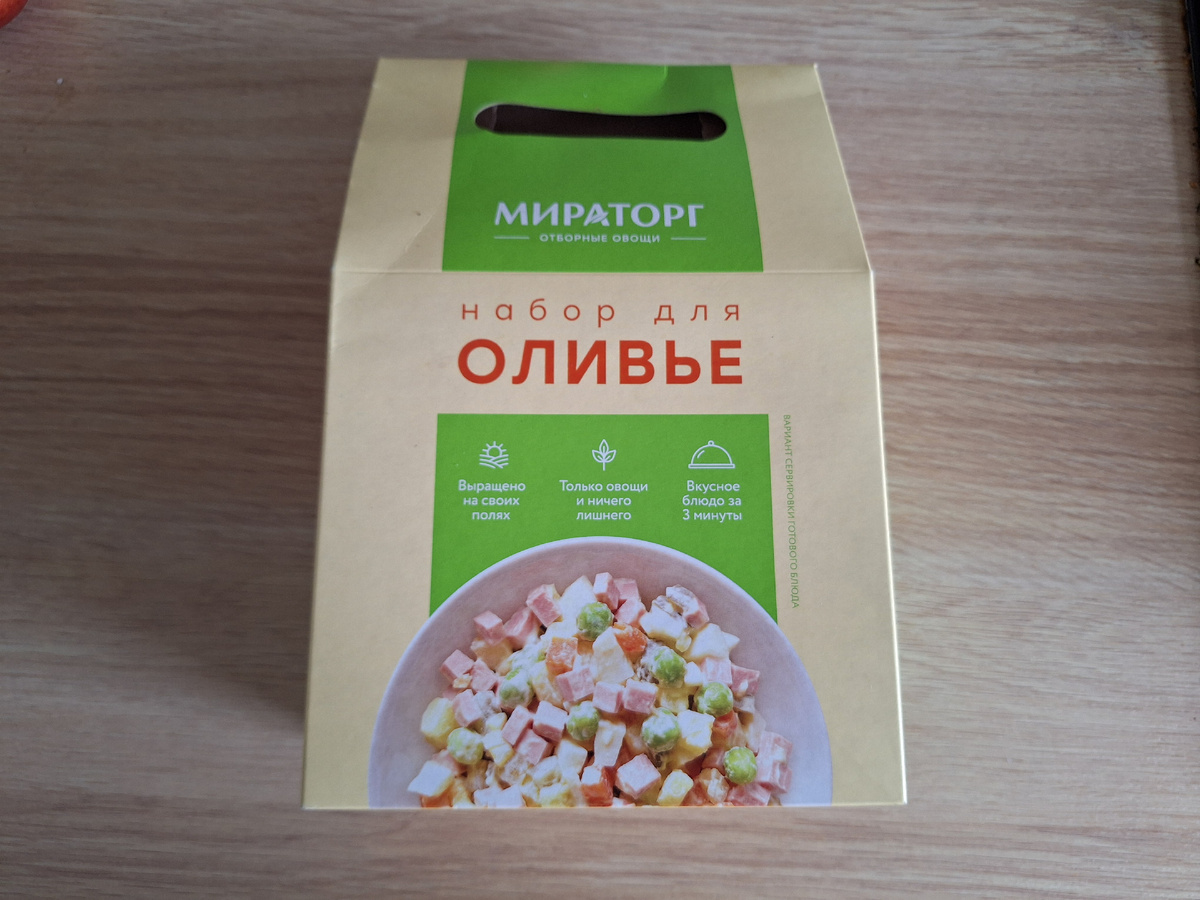 Без оливье Новый год не праздник! А тут он ещё и в магазине, такой нарядный, новогодний и, что немаловажно, почти готовый! Беру. Всё ради вас. Обычная упаковка с понятным содержимым. Наверняка вы видели нечто подобное — вакуумированные пакетики с отваренными овощами на полках магазинов. Упаковка — гордость маркетологов. Нам обещают, что всё выращено на своих грядках, без лишних добавок, и готово за три минуты. Состав указан. Всё выглядит вполне честно, но как-то неаппетитно. Почему не выложить всё горкой? Или вы хотели подчеркнуть, что всё было нарезано именно такими формами? На обратной стороне упаковки есть прорезь, где лежит яркая морковь. Также подчёркивается внимание к качеству продукции. Даже огурцы засолены по старинным рецептам. Проверим. Распаковка чееек. Как только достал всё из упаковки, сразу стало ясно. Кроме моркови с обратной стороны, положить нечего. Горошек в мутном желеобразном рассоле Картофель — почти пюре А огурцы... слов не подобрать. Собираю всё в миске. Кар