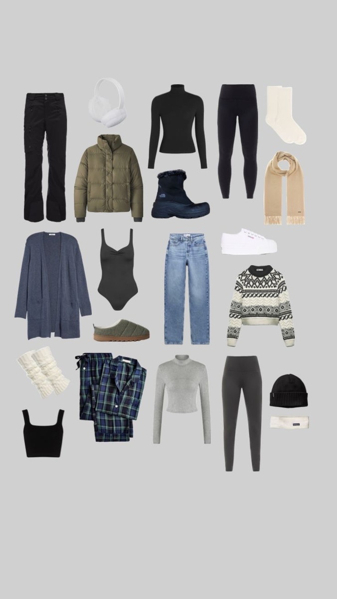 • Аксессуары: Теплая шапка, снуд, варежки, солнцезащитные очки.