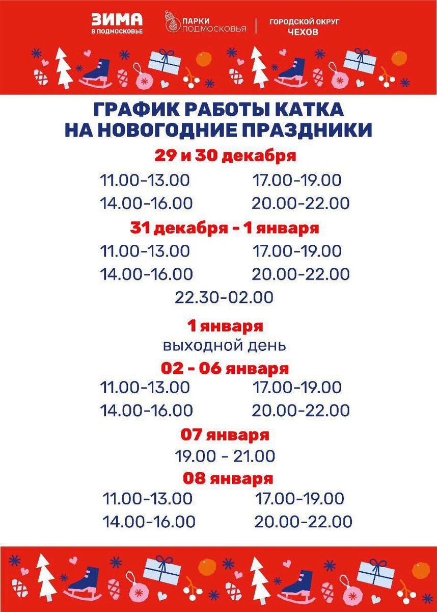 ✨ ВНИМАНИЕ! Расписание катка на Советской площади в новогодние праздники ⛸️ 🎄 28 декабря ▫️ 13:00 - 15:00 ▫️ 16:00 - 18:00 ▫️ 19:00 - 21:00 🎄 29, 30 декабря ▫️11.00 - 13.00 ▫️17.00 - 19.00 ▫️14.00 - 16.00 ▫️20.00 - 22.00 🎄 31 декабря - 1 января ▫️11.00 - 13.00 ▫️17.00 - 19.00 ▫️14.00 - 16.00 ▫️20.00 - 22.00 ▫️22.30 - 02.00 ❗️1 января - выходной день 🎄2-6 января ▫️11.00 - 13.00 ▫️17.00 - 19.00 ▫️14.00 - 16.00 ▫️20.00 - 22.00 🎄7 января ▫️19.00 - 21.00 🎄8 января ▫️11.00 - 13.00 ▫️17.00 - 19.00 ▫️14.00 - 16.00 ▫️20.00 - 22.00 ❕ Со своими коньками вход свободный. 👉 Есть платный прокат, 150 человек за сеанс 🚫 Возраст: 3+ 🏢 Площадь перед Администрацией 📍 г. Чехов, Советская пл., д.3 🪙 Вход свободный❗️ ✅ Мероприятия Чехов https://t.me/chekhov_events
