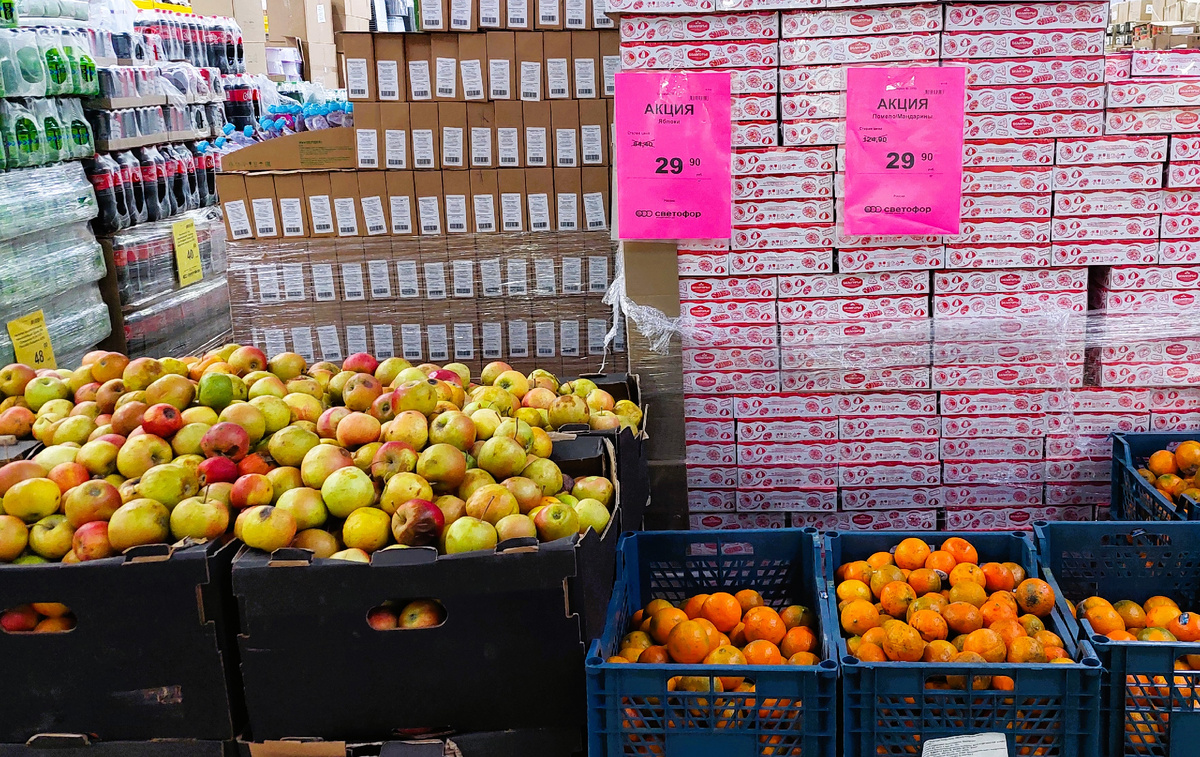 Яблоки и мандарины по одной сниженой цене 29,9 руб.