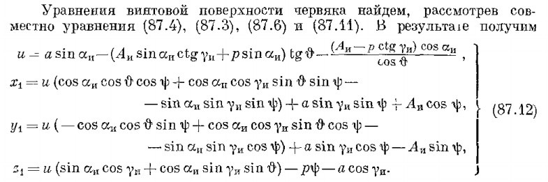 Сие: из этюдов к Единой Кинематической Теории Зубчатых Передач (ЕКТЗП). Литвин для случая нарезки червяка червячной передачи дисковой фрезой привёл такие положения: Рис.1 Отдельно Литвиным рассмотрен случай, когда угол скрещивания осей вращения нарезаемого червяка и дисковой фрезы составляет нуль градусов: Рис.2 Анализ показывает, что система уравнений из рис.1 в общем случае не имеет аналитического решения, поскольку приводит к уравнению 8-й степени. Если принять угол перекрещивания равным нулю, то уравнение значительно упрощается и имеет аналитическое решение: Рис.3 Вызывает, однако, крайнее недоумение следующее утверждение тов. Литвина: Рис.4 Это утверждение свидетельствует об отсутствии элементарного понимания кинематики взаимного движения обрабатываемого червяка и дисковой фрезы. Даже если принять, вопреки рис.3, что «производящая кривая» будет отрезком прямой, то даже в таком случае эвольвентная поверхность получается при «обкаточном» движении этого отрезка относительно червяка.