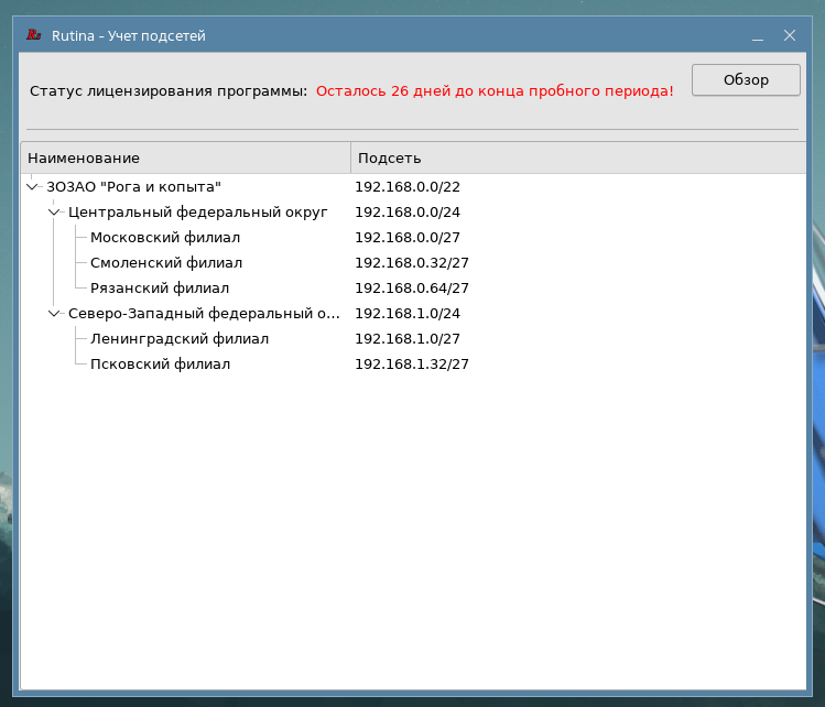 Несмотря на скудные возможности, от задумки до реализации ушло около года на программу Rutina-subnets (Rutina - Учет подсетей). Rutina-subnets позволяет создать древовидную структуру подсетей организации. При добавлении записи во всплывающем окне можно указать как адрес подсети, так и любой из IP-адресов в необходимой подсети. Программа проверит принадлежность введенного адреса родительской подсети, а также на принадлежность уже существующим подсетям. Все управление (создать или удалить запись) проводится с помощью контекстного меню при нажатии правой кнопки мыши. При установке программы создается группа rutina (теперь так во всех программах семейства Rutina). Запускать, вносить данные могут только пользователи, состоящие в данной группе. Получение лицензионного ключа необходимо только для Astra Linux Special Edition, для свободных операционных систем с открытым исходным кодом - не требуется. Также за выходные обновил программы: 1. rutina-desktopinfo - добавлены проверка статуса лице