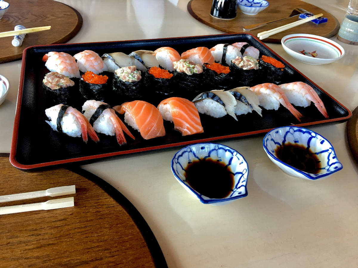 Шаг 1: Разложите суши на подогретой тарелке. Шаг 2: Украсьте суши маринованным имбирем и васаби. Шаг 3: Подавайте суши с соевым соусом для макания.