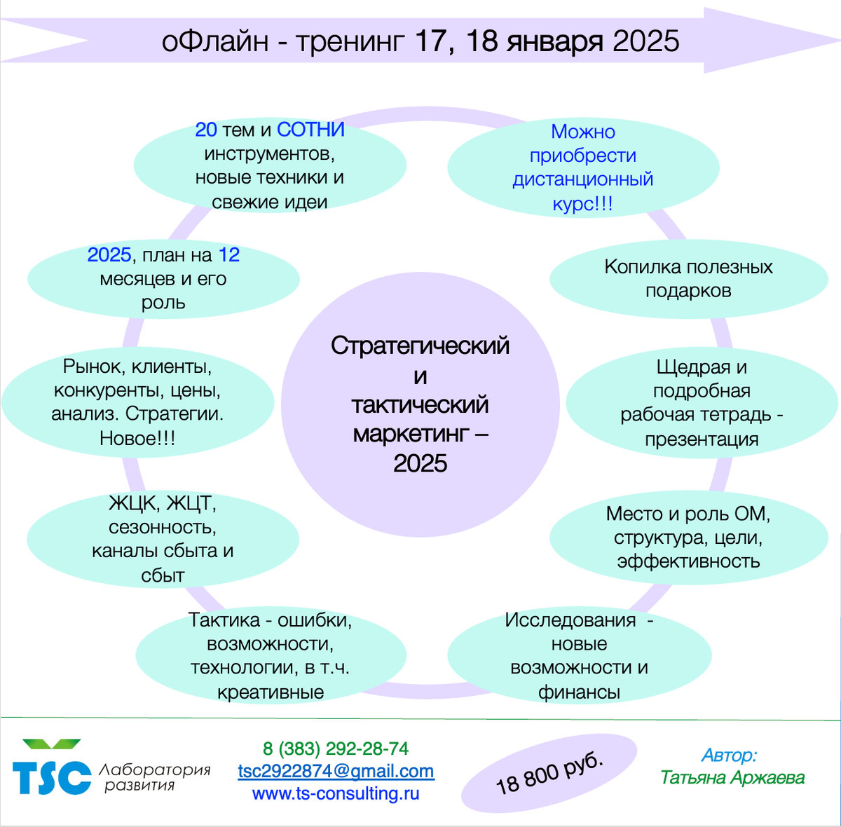 Примечание: Вся программа этого тренинга максимально заточена на то, чтоб по ее итогам у Вас появился или был скорректирован план маркетинга на 2025 год. Для того, чтобы маркетинговая деятельность была результативна, работала на опережение, ее необходимо тщательно спланировать и желательно заранее. Но очень часто на это нет времени, сил, желания, идей и творчества, достаточного количества знаний или мотивации. Участие в этом тренинге позволит решить все эти вопросы! Единственное что Вам останется – так это приехать в офис и перенести план в компьютер. И, конечно же, реализовать его с получением желаемого результата. Программа / 2 дня с 9:00 до 18:00 1. Организация: миссия (и ее монетизация), цели, задачи стратегические и годовые, компании и в области маркетинга. Рынок и место, роль компании на рынке. 2. Маркетинг: цели и задачи, структура (стратегический и операционный – тактический, их взаимосвязь и взаимодействие). Роль, функции, место в организации. 2 ключевых подхода. 3. Отдел марк