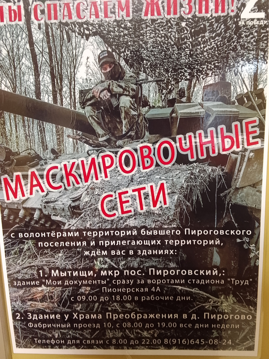 Добровольцы в самых разных городах и сёлах нашей Родины организуют изготовление маскировочных сетей, окопных свечей, носилок, вяжут тёплые носки. Если приводить в пример мой пос. Пироговский и его окрестности - у нас есть 2 цеха по плетению маскировочных сетей: в пос. Пироговский (ул. Пионерская, 4А, здание "Мои документы", работает по будням) и в деревне Пирогово (Фабричный проезд, 10, в здании на территории храма, плетение ведётся ежедневно). Я вот как раз по выходным в последнем цеху и тружусь. Недавно открылся ещё один цех по плетению сетей в деревне Жостово в доме культуры. Земляки, если вы хотите помочь фронту, звоните нашему координатору Татьяне по телефону 89166450824. Мы не только плетём сети, у нас тоже собирается гуманитарка на фронт, у нас делаются окопные свечи, наши женщины вяжут тёплые шерстяные носки на фронт.