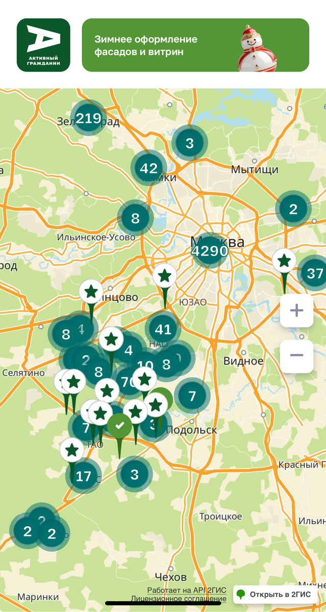 Вот это сюрприз сегодня нам приготовил Активный гражданин! Открылась новая акция - оценка новогоднего оформления фасадов и витрин магазинов. https://ag.mos.ru/map/winter2025 Нужно пройти по ссылке и оценить, насколько красиво предприятия общепита и магазины украсили к новому году свои входы и здания снаружи. Можно также открыть эту же карту из вашего приложения АГ, сверху появился баннер акции. На карте нанесено более 4800 точек и за кажду оценку дается 3 балла. То есть если у вас хватит сил и времени оценить все точки, то вы получите почти 15 тысяч баллов!!! Кроме того, для этого задания не нужно мотаться по Москве, что-то искать, фотографировать. Сидите дома в свое удовольствие и оцениваете красивые фотографии! :) Я оценила для пробы 5 фотографий и довольно быстро баллы пришли на аккаунт. Но не так быстро, как после обычной оценки новинок, минут через 5 примерно. Очень рекомендую сделать это задание хотя бы частично, сколько успеете - это отличный шанс получить много баллов максим