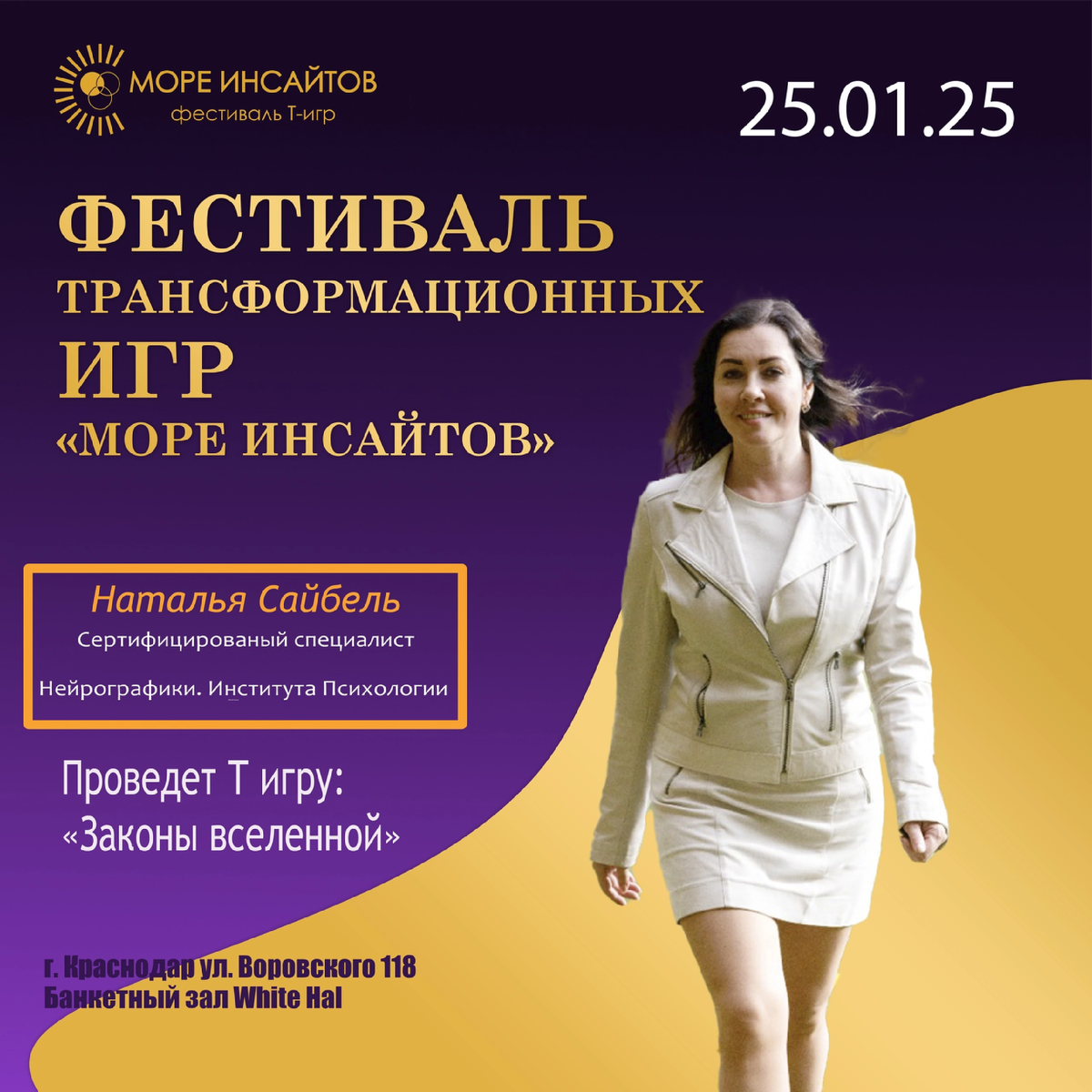 Наталья Сайбель Единственный игропрактик в Краснодарском крае, который проводит игру «Законы Вселенной». Уже более двух лет активно участвую в международных трансформационных фестивалях, где нахожу крутые инструменты для эффективного проведения игр. Люблю людей. Со мной весело, легко и всегда по делу. Моя цель — помочь каждому найти самый короткий путь к достижению желаемого. В обычной жизни я работаю с бизнесом и развитию партнерскую сеть в крупном российском Банке. В бизнесе с 2005 года, запустила оптово-розничный центр сантехники, магазин для беременных, консалтинговые услуги для бизнеса и аутсорсинг для зарубежных компаний. При этом я мама двух подростков, жена, фанат футбола и рок-н-ролла, лыжница и путешественница (20 стран), которая также как и многие стремится к гармонии и счастью! Моя жизнь — чья-то мечта, а ваша, возможно, моя. Так давайте вместе жить свою лучшую жизнь, для этого во Вселенной все есть, если соблюдать её законы. Игра "Законы Вселенной" Первая в истор