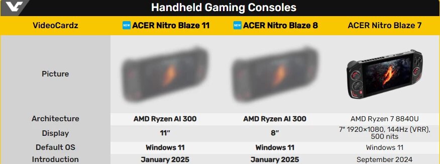 Свежая инсайдерская информация сообщает нам о том, что компания Acer готовит еще две портативные консоли в дополнение к уже анонсированной Blaze 7. Если последняя имеет 7-дюймовый экран и работает на AMD Ryzen 7 8840U, то у еще двух внутри будут использоваться уже более современные и мощные AMD Ryzen AI 300. Этими консолями станут Blaze 11 и Blaze 8, которые похвастаются 11 и 8-дюймовыми экранами соответственно. Других подробностей о начинке этих устройств у нас пока нет, но высока вероятность, что их официальный анонс состоится уже на грядущей выставке CES 2025. Blaze 7, напомним, пока еще не добралась до полок магазинов.