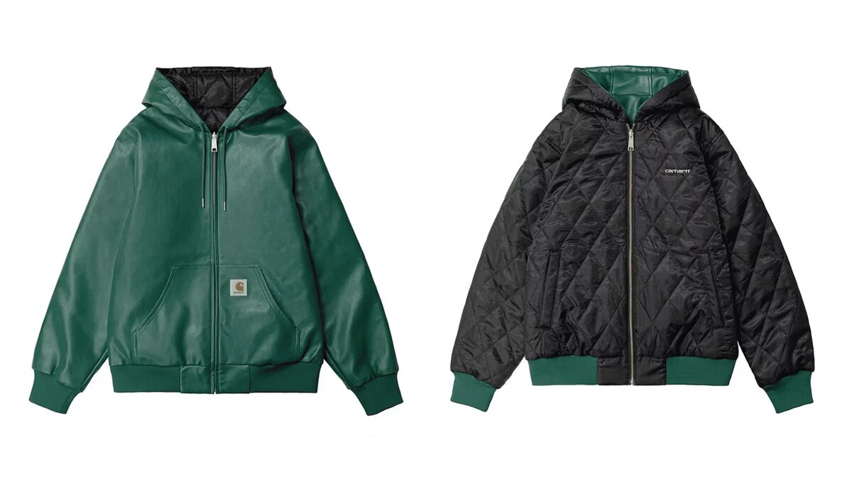 В честь начала нового года Carhartt WIP выпустила уникальную версию куртки Active Jacket, которая будет доступна исключительно в Японии. Куртка изготовлена из полиуретана, что придаёт ей вид и текстуру, напоминающие натуральную кожу. Модель выполнена в прямом силуэте и оснащена двусторонним дизайном: одна сторона выполнена в однотонном зелёном цвете с кожаным эффектом, другая – в чёрном стёганом стиле. Обе стороны дополнены карманами и фирменным логотипом Carhartt. Золотая молния и её зубцы добавляют изысканности, а манжеты и пояс выполнены из эластичного материала для удобной посадки.