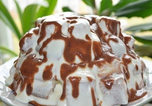 20 гр. сл. масла. Приготовление: Смешиваем все ингредиенты для теста, взбиваем и ставим в холодильник на 30 минут. Отделить 1/3 теста, в оставшееся добавить 1 ст. л. какао и перемешать. Выпечь 1 светлый и 2 темных коржа. 1 темный корж корж кладем на тарелку, остальные режем произвольными фигурами (ромб, квадрат, треугольник). Взбиваем 0,5 л. сметаны с 1 ст. сахара. Основу наколоть вилкой и смазать кремом. Каждую фигурку обмакиваем в крем, выкладываем на основу, формируя, развалины. Варим глазурь:1 ст. л. сахара, 1 ст. л. сметаны, 1 ч. л. какао и 20 гр. сливочного масла. Сварить и остудить. Полить торт. Убрать в холодильник на 4 часа и более для пропитки.